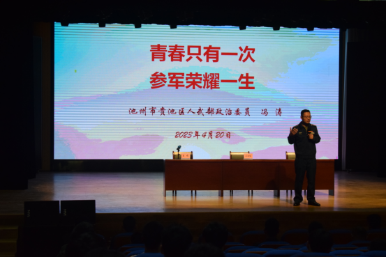 冯涛以《青春只有一次,参军荣耀一生》为题,结合自身经历,从入伍保障政策、入伍条件要求以及应征程序三个方面,详细生动地解读了与大学生切身利益息息相关的参军政治经济待遇、部队发展空间、退役优待等政策,以激发同学们携笔从戎,参军报国的热情,鼓励大家到祖国需要的地方,到人民需要的地方建功立业,逐梦青春,实现价值。