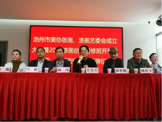10月7日上午,池州市美协版画、漆画艺委会成立大会暨2022漆画创作研修班开班,版画、漆画创作基地揭牌仪式在艺术楼103室举行。安徽省美协漆画艺委会主任范福安、秘书长王屹,张家港市书画院院长徐华翔,池州市美协主席陆可、党支部书记程梅、副主席方杰,贵池区美协主席罗和平,石台县美协主席聂松柏,艺术与教育学院院长魏鸿飞、美术教研室主任方向、创作研修班导师潘珍珍、林国霞副教授及艺委会委员和创作班学员出席了会议。会议由方杰主持。