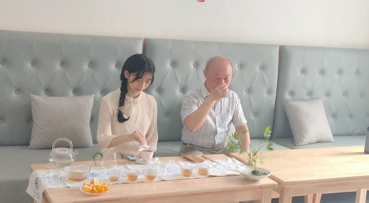 茶艺社社员穿梭在公共教学楼内,在课间休息时为辛勤工作的老师们奉上一杯杯新茶,以感师恩。