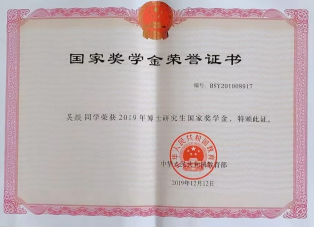 吴燚读博期间获得国家奖学金荣誉证书