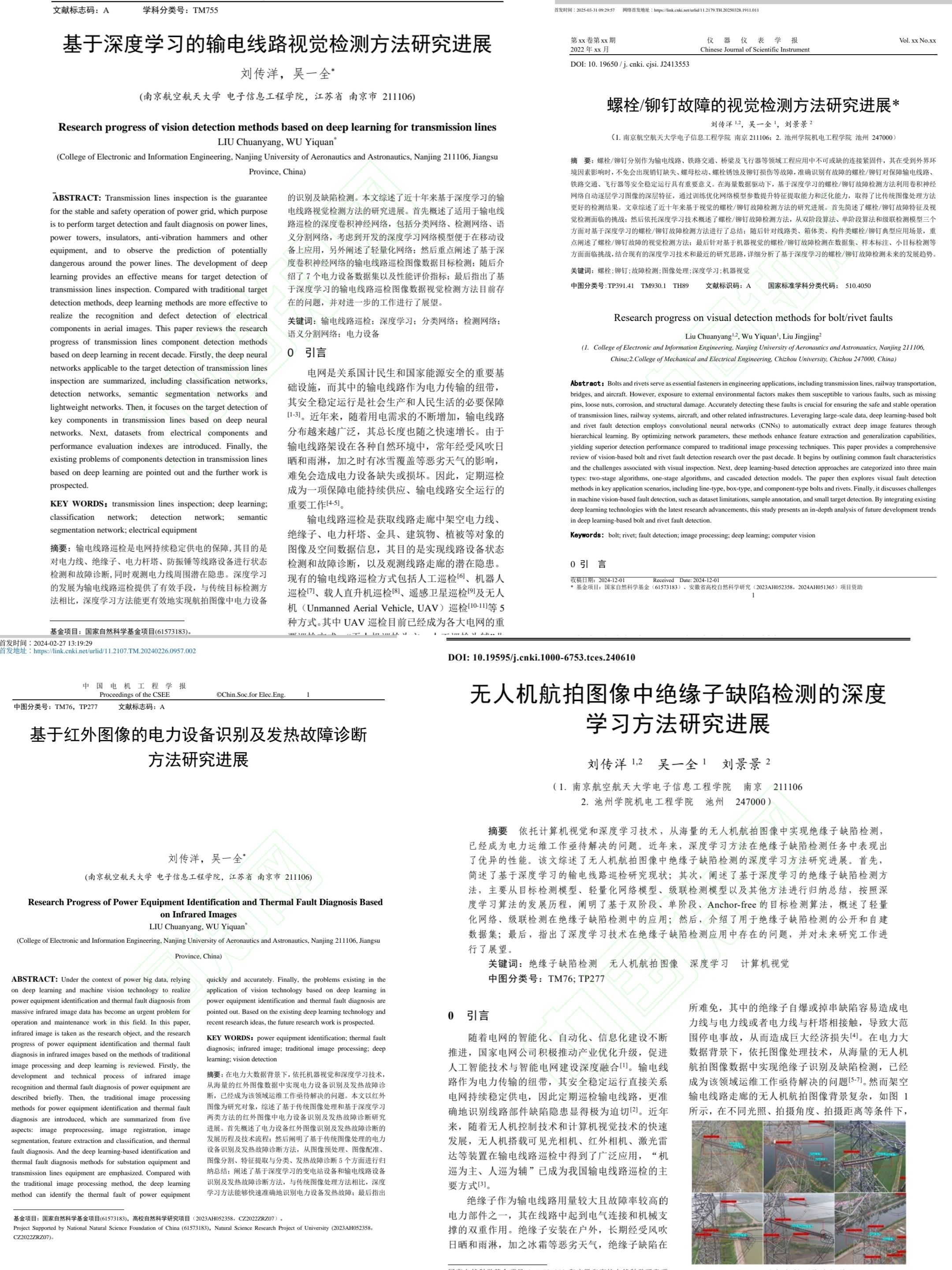 他的核心研究方向——基于红外图像和深度学习的输电线路视觉检测与发热故障诊断,精准对接国家智能电网建设和新能源发展战略中的迫切需求。“传统人工巡检面临地形复杂、效率低下且存在高空作业风险等问题。”刘传洋解释道,“我们的研究,就是希望通过无人机搭载高清摄像头、红外热像仪等设备,结合AI图像识别技术,实现高效、精准的自动化巡检。”谈及选择这一方向的契机,他归功于导师的深远影响。“导师在电机工程图像领域的研究启发了我。他常说:‘让技术落地,服务社会发展。’”2024年,他以第一作者身份发表在《中国电机工程学报》上的论文荣获“高影响力论文”奖,该研究系统综述了深度学习在输电线路视觉检测中的应用,体现了学术研究与国家需求的结合。