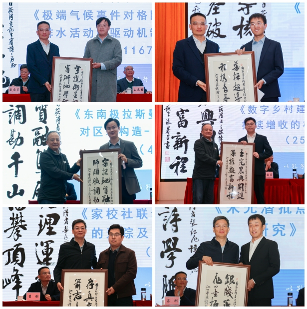 会上,科研处就科研诚信和学风建设政策进行了宣讲。2025年国家自然科学基金获得者范宇宾、叶程、宗师,国家社会科学基金获得者王杰、毕存箭、张银飞分别作交流发言。校领导为六位老师颁发勉励墨宝。