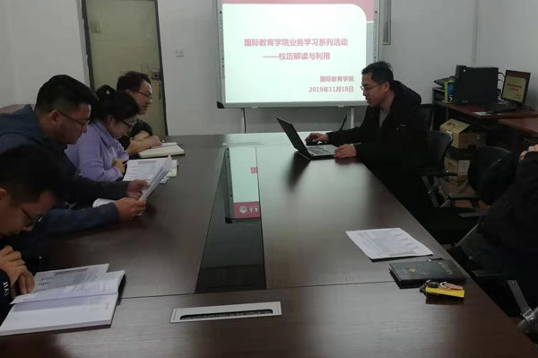 本网讯(通讯员 殷金楠)11月18日下午,国际教育学院举办了业务学习系列活动的第一场活动——校历的解读与利用,学院副院长逄焕利带领辅导员老师、教学秘书、外事秘书对校历进行了认真地分析与解读。逄焕利针对校历编制过程中容易出现的问题,分别从学生管理、教学安排、外事活动的角度加以分析,提出应对策略。在学习的过程中,老师们纷纷交流了想法,提出了工作中所遇到的疑惑,逄院长一一为其解答。