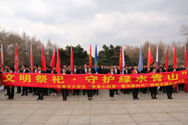本网讯(学生通讯员 刘禹诺 邢晋)青山肃立,绿水长歌。4月5日清明节一早,国际教育学院春风志愿者协会等长春市19所高校的21支志愿服务组织,前往南湖公园共同参加“倡导文明祭祀,守护绿水青山”——长春市大学生“青春心向党·建功新时代”主题团日活动。
