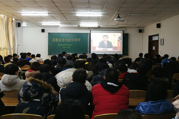师生们边看边交流,在深切感受我国改革开放40年取得重大成就的同时,对习近平总书记描绘的新目标、新蓝图充满期待。收看现场掌声不断,大家认为,改革开放是中国共产党在新的时代条件下带领人民进行的新的伟大革命,取得了历史性成就,发生了历史性变革,深刻改变了中国的命运,使中国人民稳定地走上了富裕安康的广阔道路,而且为世界经济发展和人类文明进步作出了重大贡献。师生们纷纷表示,要更加紧密团结在以习近平同志为核心的党中央周围,高举中国特色社会主义伟大旗帜,不忘初心,牢记使命,将改革开放进行到底。