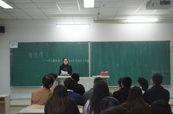 (通讯员 殷浩宇)为促进党员积极学习党的先进思想,提高理论知识水平,国际教育学院直属党支部在2017年11月1日于南湖校区教学科研楼2107组织召开了支部党员理论学习会。本次会议由辅导员李守瑶主持,新青年理论协会负责人孔庆研主讲,国际教育学院全体学生党员参加了此次集中学习。